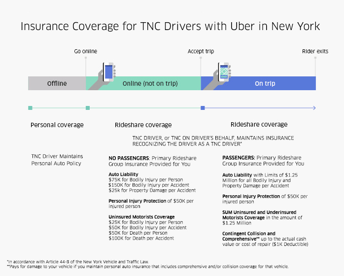 In general, New York law requires that New York Uber drivers and riders are entitled to insurance policies consisting of a minimum of $50,000 per passenger and $100,000 per occurrence when the driver is logged into the app and is receiving transportation requests. Further, a $1,000,000 minimum is in effect for each passenger trip, from the moment the trip is accepted until drop-off.